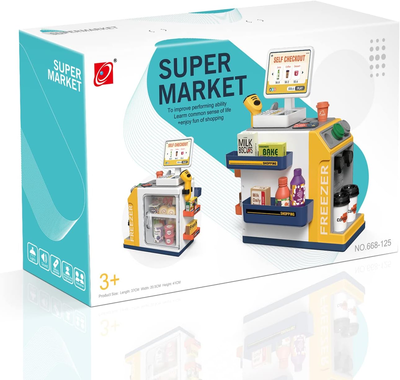 Cash Register Playset for Kids – 48PCS Pretend Play Money, Calculator, Scanner, Credit Card and Play Food for Boys and Girls Ages 3+ (668-125)Create a new description for this product from the title with 500 characters