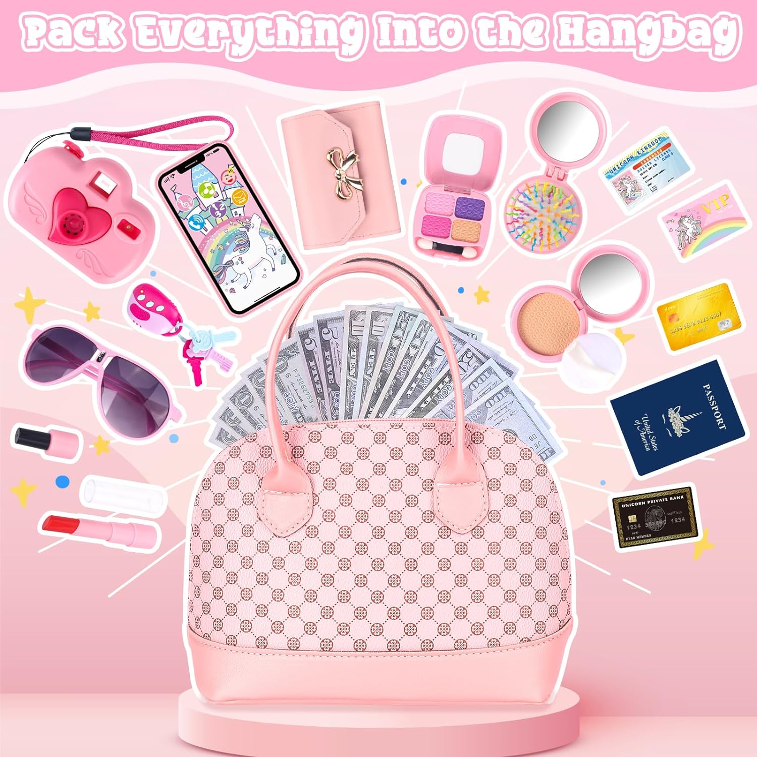 【 35 Pcs Travel Play Purse Set 】The girls toys purses has everything the little girl needs when going out. Including Handbag*1, Purse*1, Flash Camera*1, Mobile Phone with sound*1, 1*Remote Car Key with 3 keys, Sunglasses*1, Pretend Makeup Kit (Lipstick*1, Face Powder*1, Powder Puff*1, Nail Polish*1, Eye Shadow*1), Hairbrush*1, Play Money*15, Bank Card*1, Credit Card*1, VIP Card*1, Passport*1, Driver License*1. Your child will get all the items to satisfy your child’s social skills,like her mom.